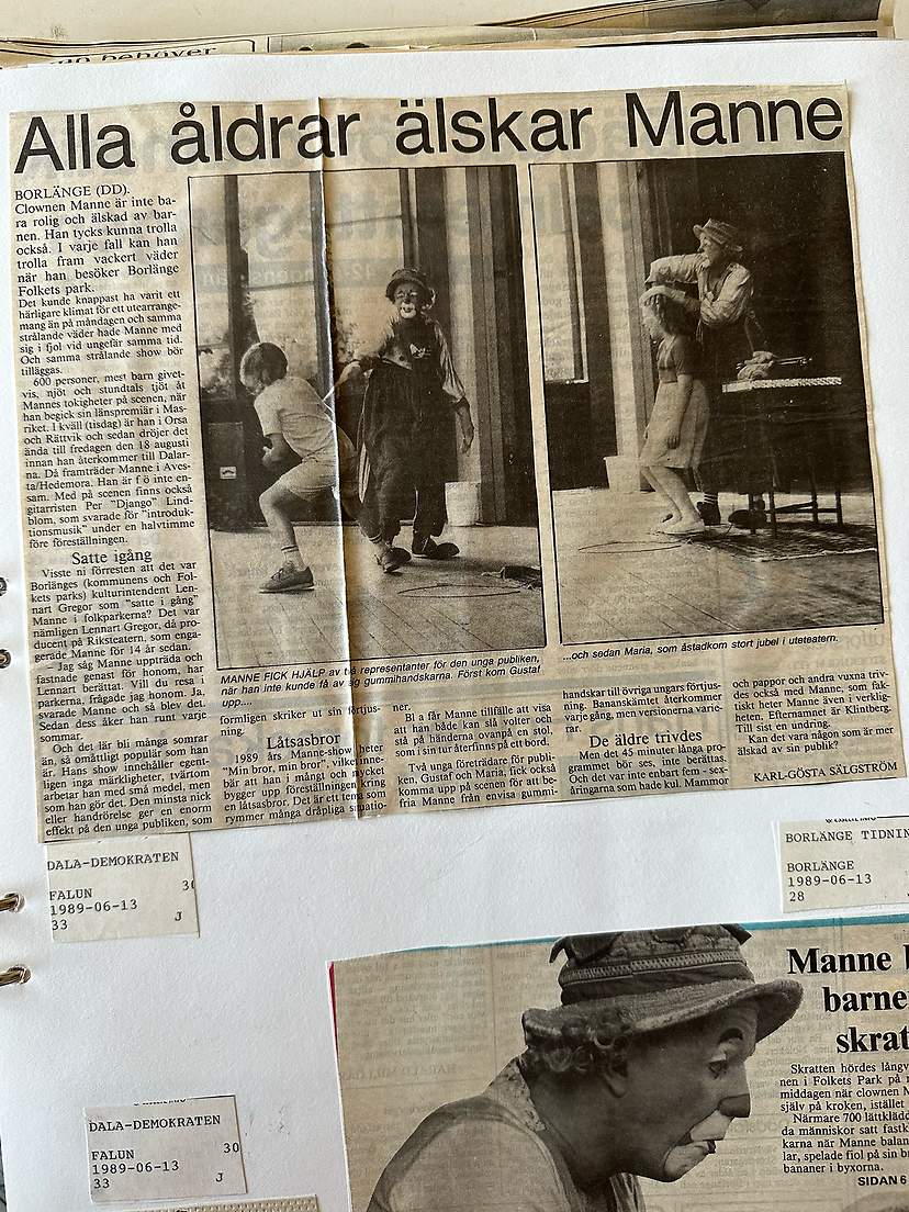 I sommar ger jag 16 föreställningar i Parkteatern, där jag nu arbetat i snart 50 år. Vi hade ett uppehåll ett år då Parkteatern inte satsade på barnkultur just då och också tog bort kransbildningar och midsommarfirande och annat som lockade turister. Så Seved Bornehed och jag gjort ”Manne och Koko apkonster” på Fjäderholmarna. När så Sigrid Sällström, producent för barn inom Parkteatern på 1990-talet, ordnade sponsring från Sparbankerna för barnföreställningar, så vi flyttade föreställningen ”Manne och Koko” till Galärparken. Då Benny Fredriksson blev VD pratade jag med honom om att publiken och jag har ett kärleksförhållande. Han såg min föreställning och sa att han förstod vad jag menade och sa att ”du ska vara kvar i Parkteatern” där vi varit sen dess. Det är Bennys arv.